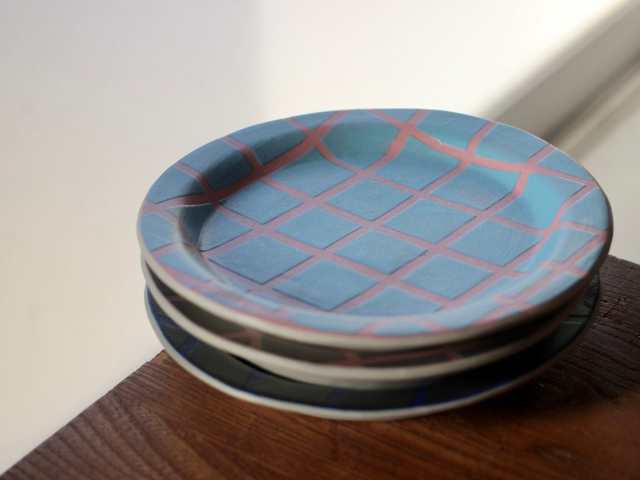 アンダーの色を施しマスキングをした後上に乗せる色を施してマス目模様をデザインしています。