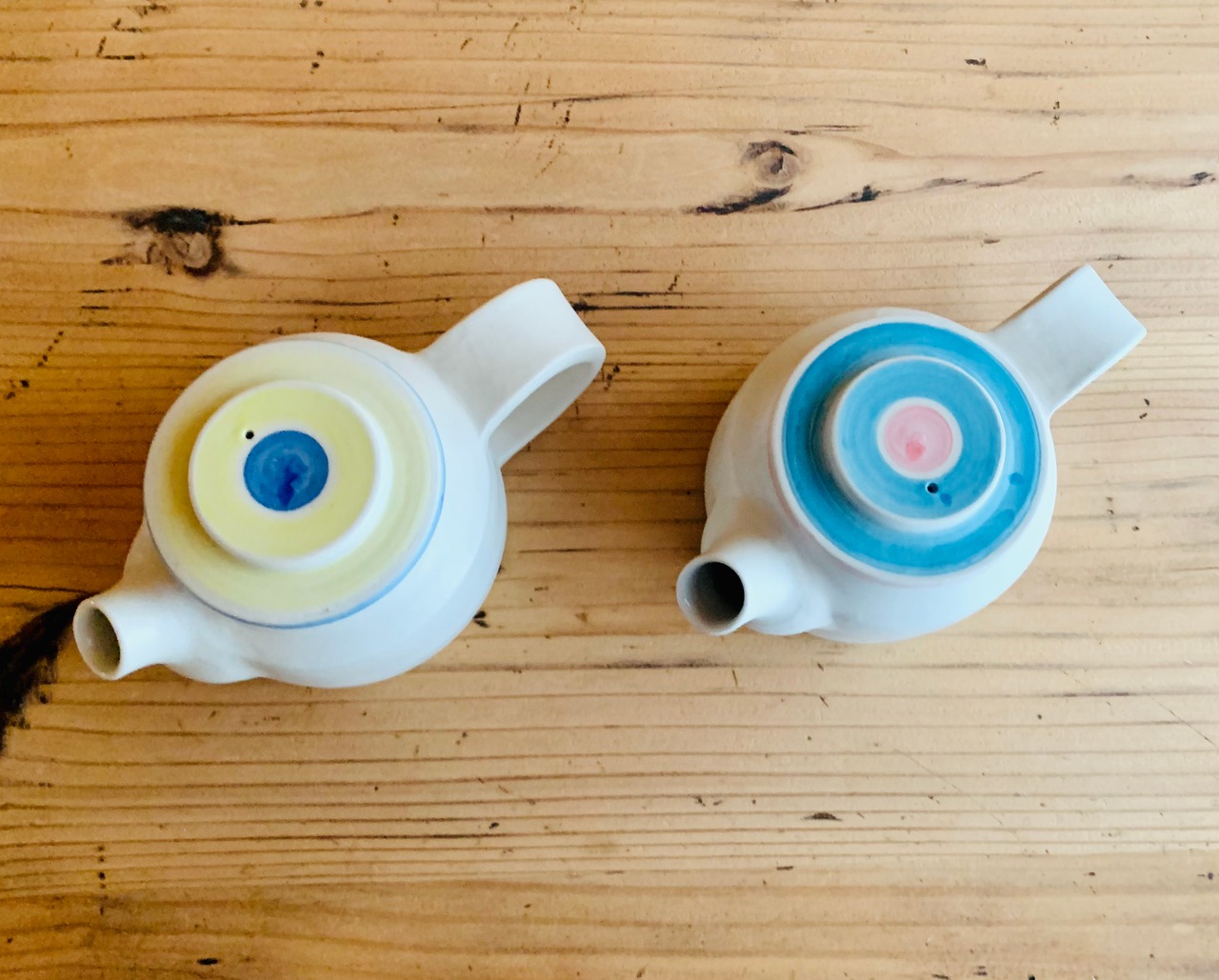 シンプルな絵付けですが色の配色をポップに形はコロンとした可愛らしいデザインです。